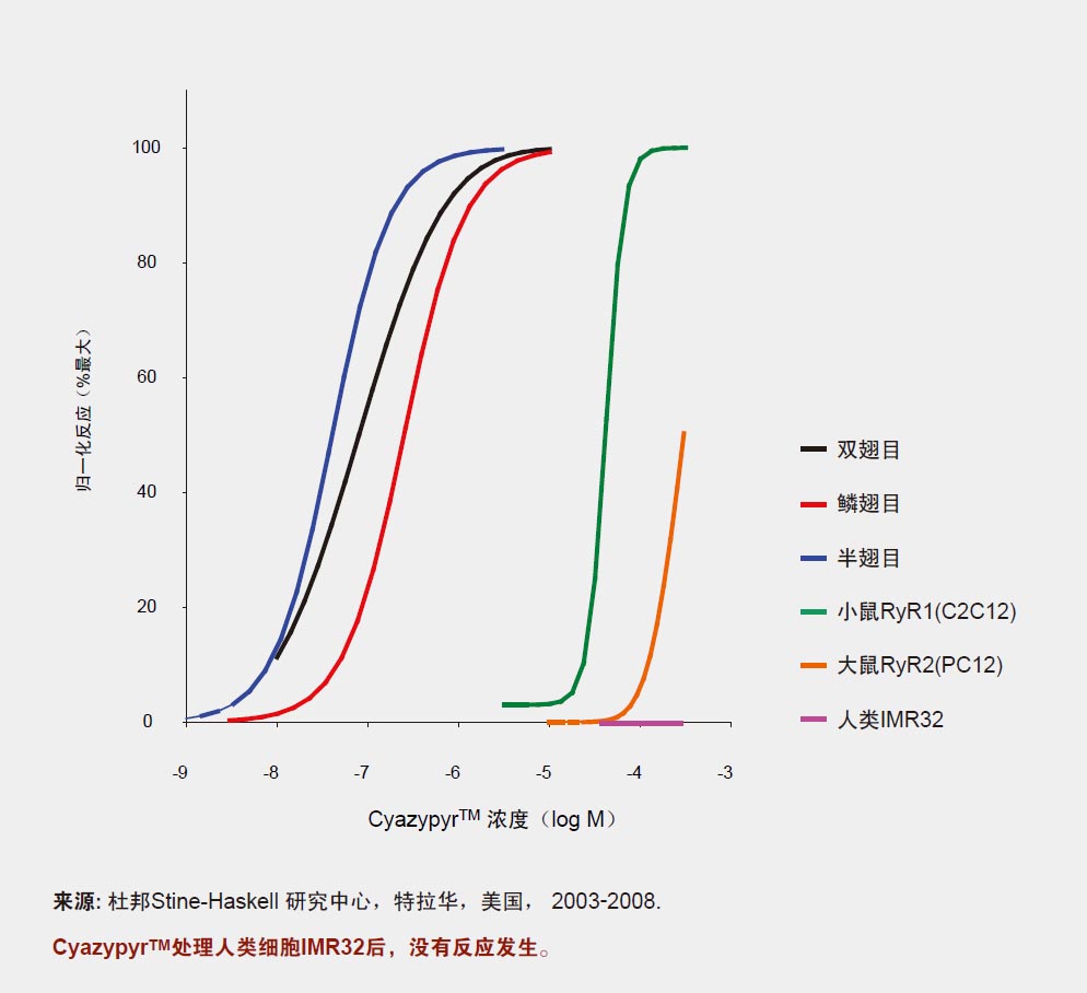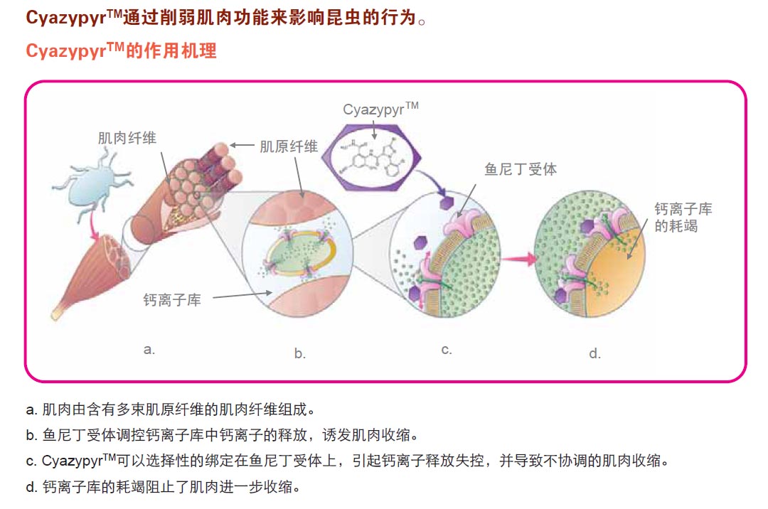CyazypyrTM能夠激活昆蟲魚尼丁受體(RyRs),該受體對(duì)肌肉功能起到關(guān)鍵作用。肌肉的收縮需要鈣離子從細(xì)胞 內(nèi)鈣庫(kù)中釋放到細(xì)胞質(zhì)內(nèi)。魚尼丁受體起到選擇性離子通道的作用,可控制鈣離子的釋放。CyazypyrTM分子可以和 魚尼丁受體結(jié)合,導(dǎo)致鈣離子的流失,從而阻止肌肉進(jìn)一步收縮。