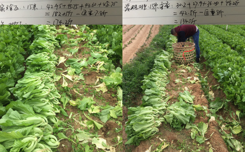 再來看看我們收菜原版手寫體的收菜記錄,倍甘組合區(qū),上午下午的蔬菜品質和產量遠超農戶常規(guī)防治方法。