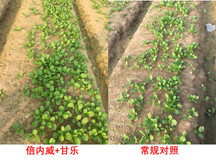 (4月18日,第二次施藥后7天觀察,倍甘區(qū)菜蟲咬口少,苗壯濃綠,平均多1-2片葉)