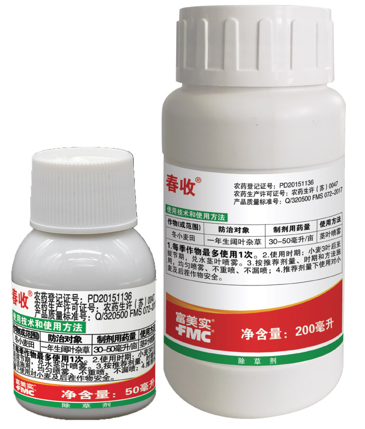春收® 為美國富美實(FMC) 公司研發(fā)的麥田闊葉莖葉除草劑,具有內(nèi)吸傳導和觸殺作用,能有效防除麥田多種闊葉雜草,對難防除及抗藥性雜草具有顯著的防除效果,尤其對播娘蒿、豬殃殃、繁縷等闊葉雜草特效,除草快速、徹底、不復發(fā)。