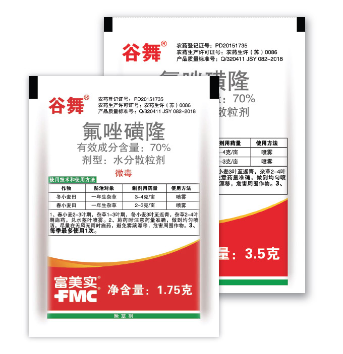 谷舞® 是美國富美實(FMC) 公司推出的小麥田高效安全禾本科除草劑,為內吸型苗后莖葉除草劑,可被雜草的根和莖葉吸收;對雀麥和野燕麥特效;在小麥體內可很快代謝,對小麥具有極好的安全性;同時可混用性好,省工省力。