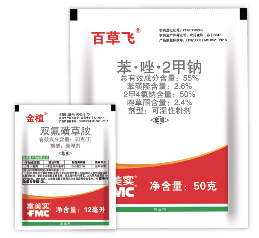 百· 金( 百草飛®+ 金植®)為美國(guó)富美實(shí)(FMC) 公司全新推出的 高效廣譜小麥田莖葉除草劑組合,能快速有效防除麥田豬殃殃、播娘蒿、澤漆、寶蓋草、野油菜、婆婆納、麥家公、薺菜等多種闊葉雜草。