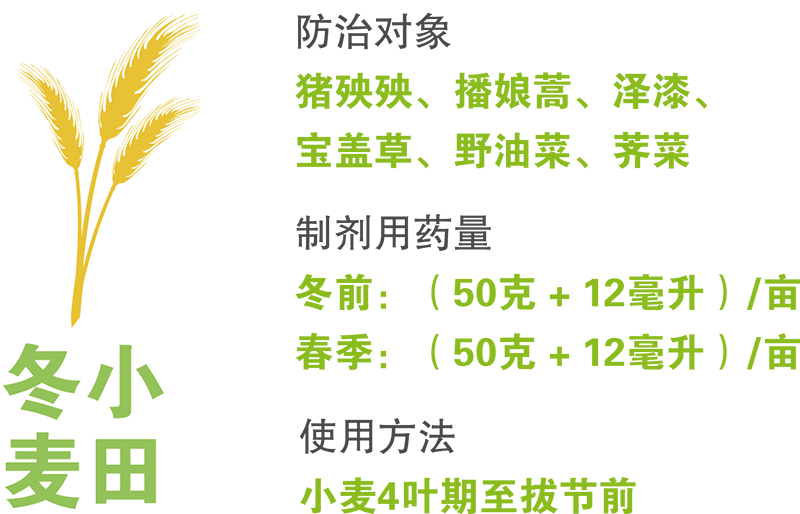 殺草廣譜:能有效防除豬殃殃、播娘蒿、澤漆、寶蓋草、野油菜、婆婆納、麥家公、薺菜等多種 闊葉雜草。