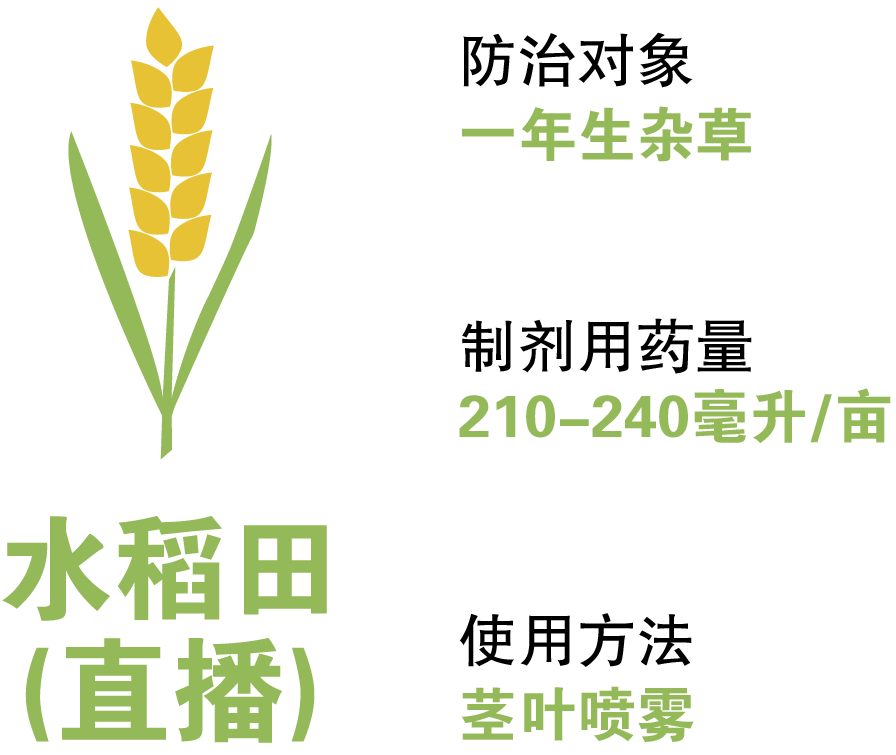 ●最佳施藥期是水稻2 葉1 心后,禾本科雜草3 葉期左右,均勻噴霧,不重噴、不漏噴。