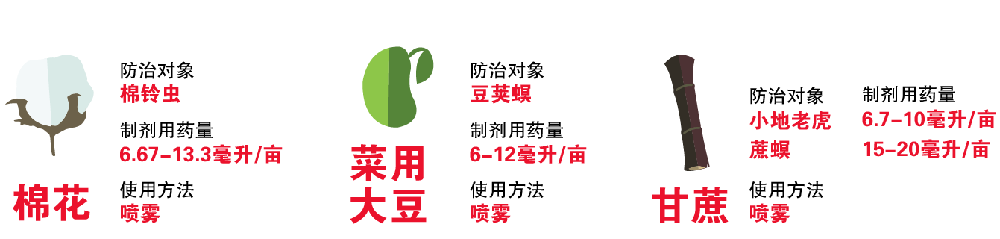 康寬® 是基于氯蟲(chóng)苯甲酰胺的新型水稻、玉米、甘蔗、菜用大豆、棉花殺蟲(chóng)劑,具有新型作用機(jī)理。施藥后讓害蟲(chóng)立即停止取食,從而迅速保護(hù)作物。殺蟲(chóng)譜廣,針對(duì)稻縱卷葉螟、二化螟、三化螟、大螟和稻水象甲等稻田害蟲(chóng),玉米螟、小地老虎等玉米田害蟲(chóng),蔗螟、小地老虎等甘蔗害蟲(chóng),豆莢螟等菜用大豆害蟲(chóng)和棉鈴蟲(chóng)等棉花害蟲(chóng)均能高效防除。作為一款內(nèi)吸性殺蟲(chóng)劑,康寬® 能有效保護(hù)全株作物,特別是新生葉片,因此持效期較長(zhǎng),幫助減少施藥次數(shù),且具耐雨水沖刷,水稻、玉米、甘蔗、菜用大豆、棉花種植者使用更省工。較短的采收間隔期,為種植者提供極大的施藥?kù)`活性。微毒農(nóng)藥,正確使用對(duì)登記作物安全。