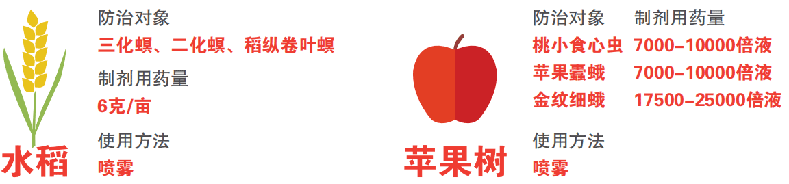 ●蘋果樹 :安全采收間隔期14 天,每季最多使用2 次。水稻 :安全采收間隔期21 天,每季最多使用2 次。