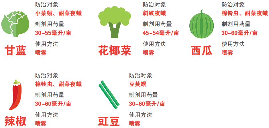 ●甘藍(lán):安全采收間隔期推薦1 天,每季最多使用2 次,間隔7 天;花椰菜安全間隔期為5 天,每季最 多使用2 次。