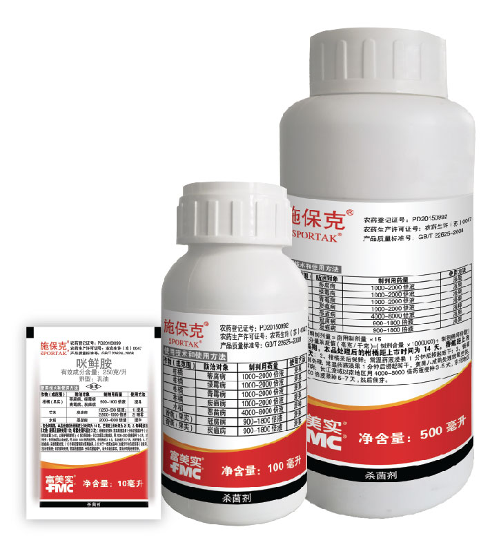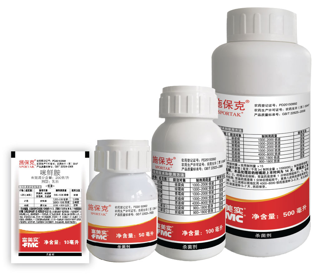 施保克® 是美國富美實(shí)(FMC)公司推出的咪酰胺類殺菌劑,具有保護(hù)作用,具接觸和局部滲透功能。速效性好、持效期長(zhǎng)、殺菌譜廣,對(duì)子囊菌及半知菌引起的多種作物病害有特效,并能有效防治對(duì)苯井咪唑類殺菌劑產(chǎn)生抗性的菌種。廣譜高效,安全低毒低殘留,被許多專家學(xué)者推薦為有害生物防治綜合多種產(chǎn)品,是抗性管理的首選產(chǎn)品。