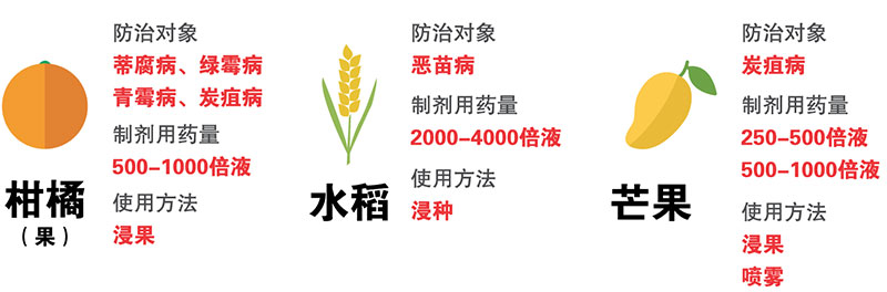廣譜高效長(zhǎng)效:適用于多種蔬菜瓜果,對(duì)子囊菌和半知菌引起的病害防效極佳,高效防治柑橘炭疽病、青霉病等。