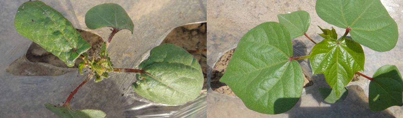 | 銳勝包衣棉花出苗整齊,成苗率高(播后25天) | 銳勝包衣棉花苗齊苗壯(播后36天) |